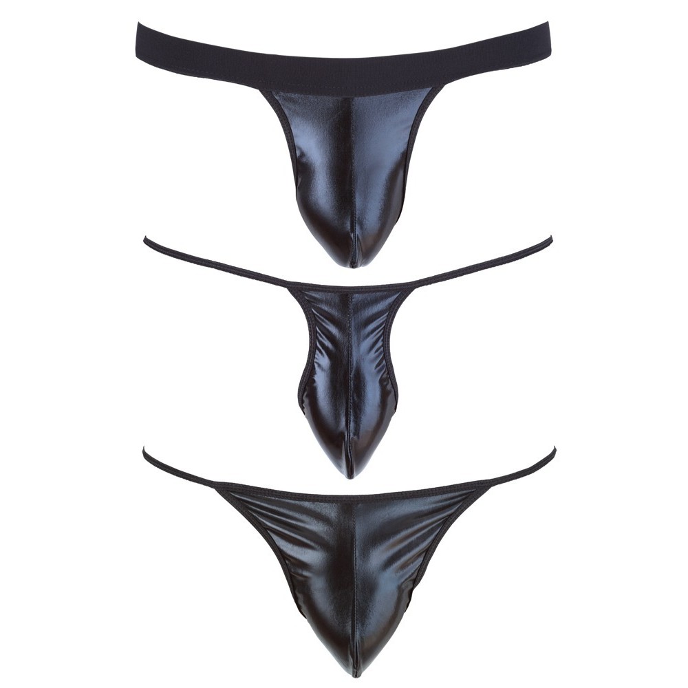É sempre bom ter estas três tangas na gaveta da roupa interior: uma mini tanga, um mini G-string e um jockstrap. Todos são feitos em material elástico preto, com um acabamento brilhante e efeito molhado.