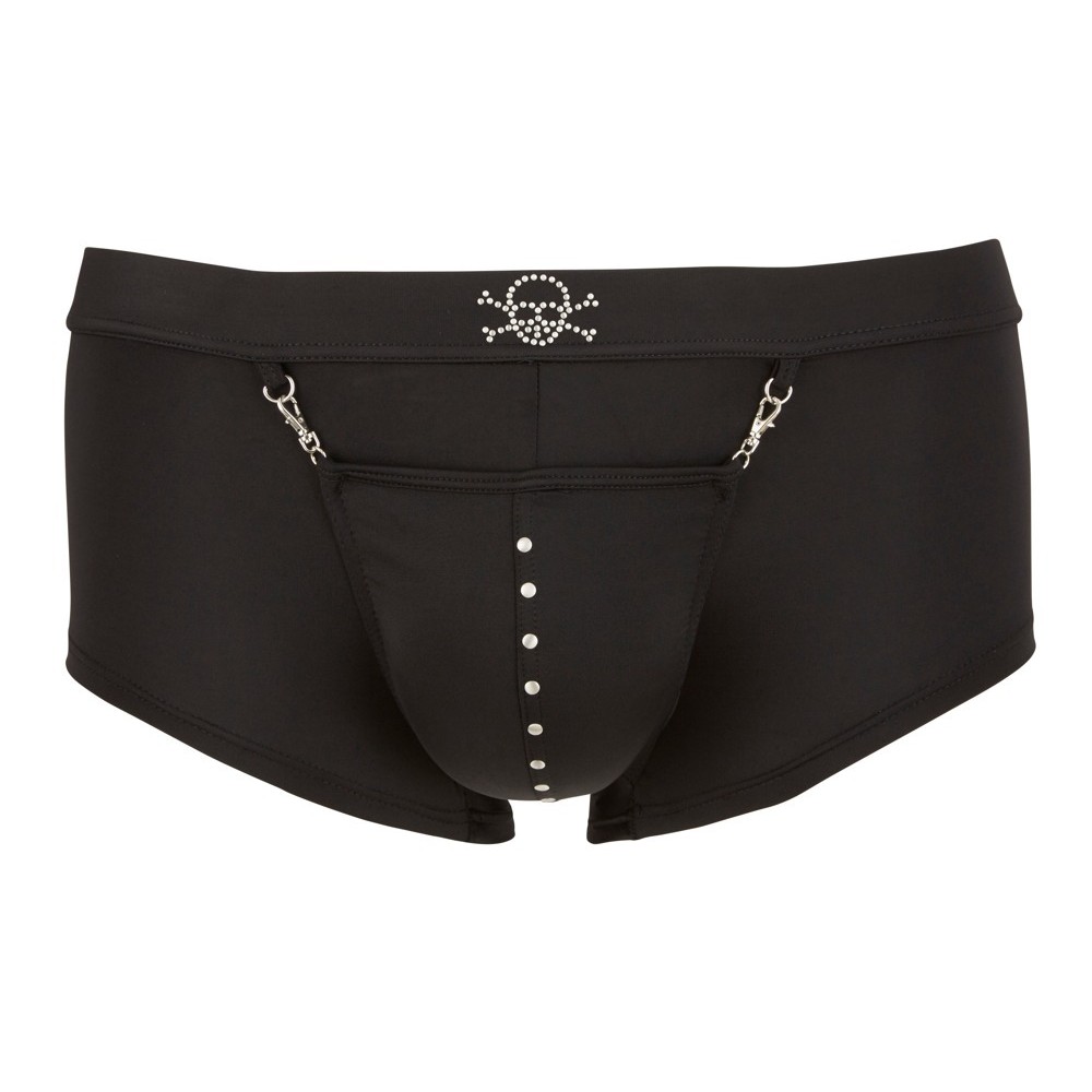 Boxers estilo pirata que realçam a silhueta, com bolsa com botões de pressão e abertura frontal. Com efeito de volume para um destaque marcante e detalhe de caveira na cintura com tachas, perfeitos para aventuras ousadas e jogos de fantasia.