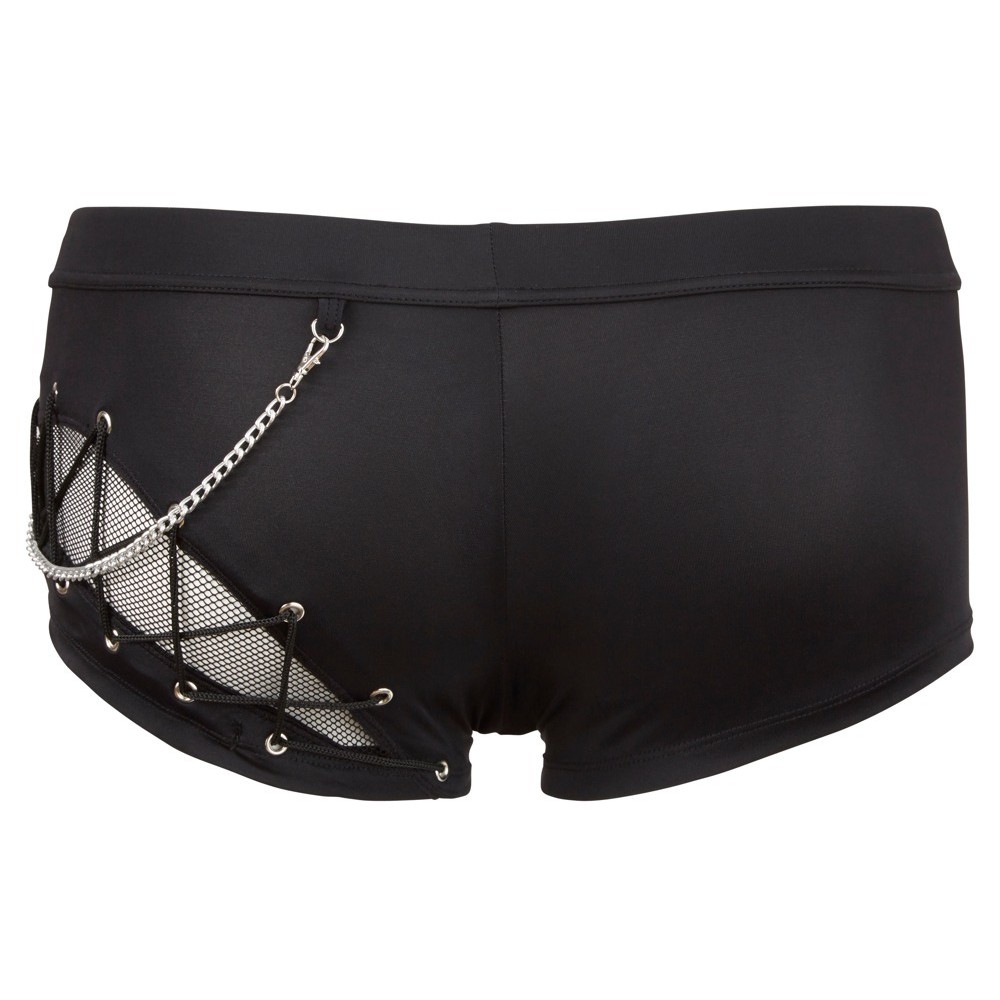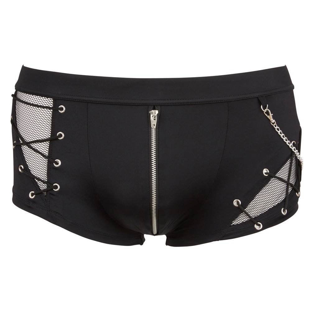Calção confeccionado com uma combinação moderna de material opaco e transparente (rede). Inclui corrente decorativa amovível e fecho de correr na parte frontal. Em preto e com elevada elasticidade para máximo conforto.