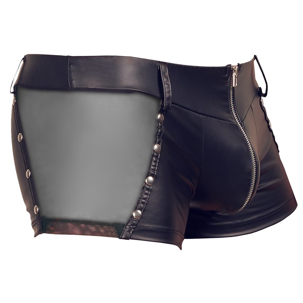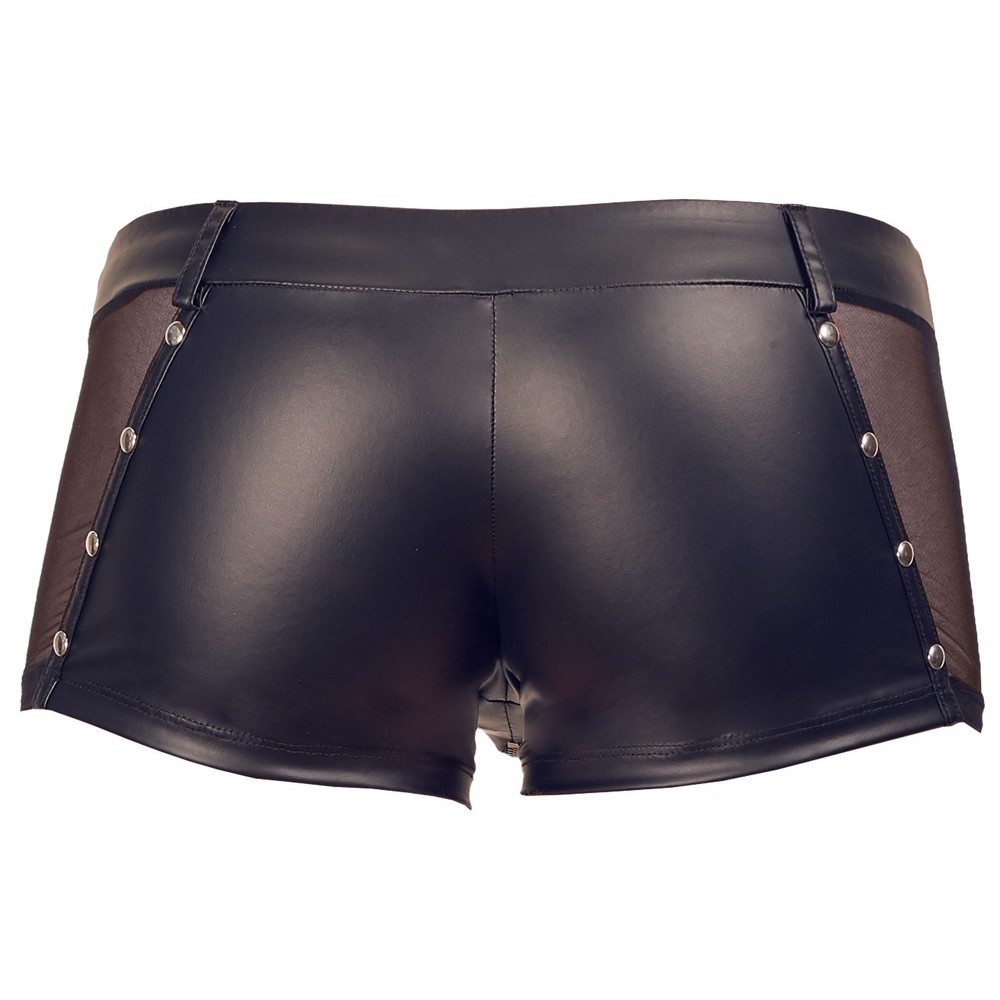 Calções da Svenjoyment que valorizam a silhueta, confeccionados em material moderno de aspeto mate, com inserções em rede transparente e tachas decorativas nos lados. Incluem presilhas para cinto e fecho acolchoado na parte frontal para um toque ousado e funcional.