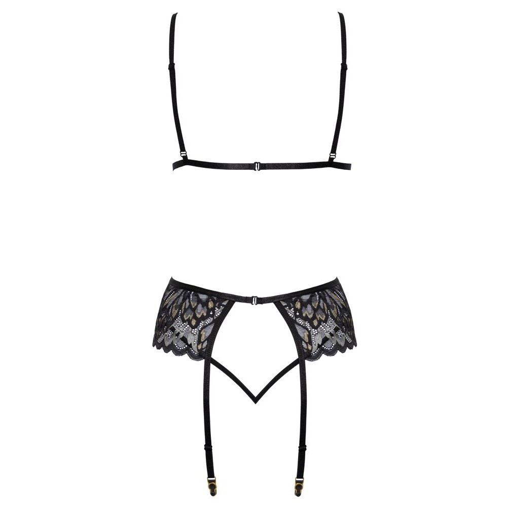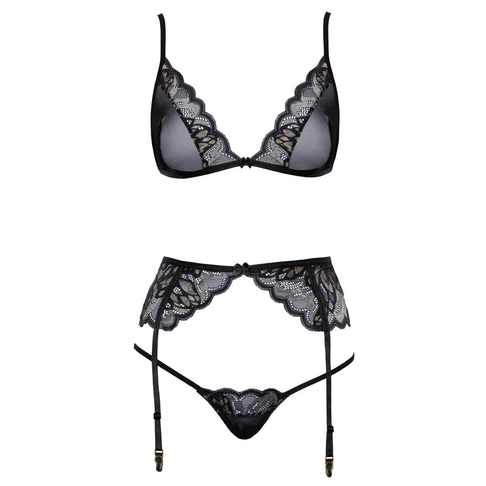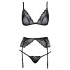 Conjunto da Kissable composto por sutiã sem aro, cinto de ligas e tanga, confecionado em renda delicada e powernet. Todas as peças são macias e elásticas, garantindo um ajuste extremamente confortável. O sutiã possui alças ajustáveis e fecho de gancho nas costas. O cinto de ligas também apresenta fecho de gancho na parte de trás e tiras de ligas ajustáveis. A tanga, de design ousado, destaca-se pelas duas tiras finas e elásticas que se unem na zona frontal.