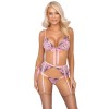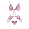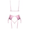 Conjunto da Kissable composto por sutiã sem aro, cinto de ligas e tanga, confecionado em delicado powernet rosa claro com elaborados bordados florais. Macio e elástico, garantindo um conforto excecional ao vestir. O sutiã apresenta um laço de cetim na parte frontal e também em cada lateral, fecho de clipe nas costas e alças ajustáveis. O cinto de ligas possui fecho de gancho na parte de trás e tiras de ligas ajustáveis. A tanga pequena é extremamente sedutora graças às suas duas tiras finas e elásticas que se unem na zona frontal.
