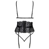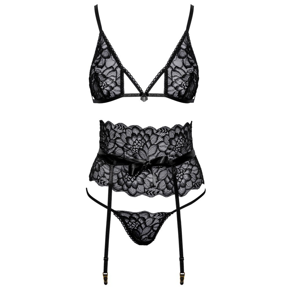 Conjunto elegante da Kissable composto por soutien sem aro, cinto de ligas e tanga, confecionado em renda preta fina. Todas as peças são macias e elásticas, garantindo um ajuste confortável. O sutiã apresenta fecho de gancho nas costas e alças ajustáveis. O cinto de ligas realça a cintura e inclui tiras de cetim apelativas que podem ser atadas à frente, além de fecho de gancho nas costas e tiras de ligas ajustáveis. A tanga sedutora destaca-se pelas duas tiras finas e elásticas que se unem na zona frontal.