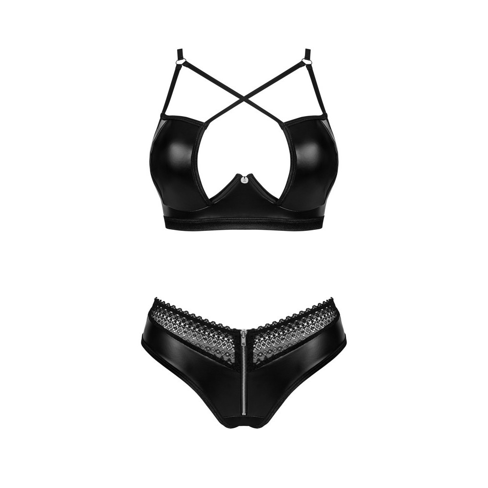 Conjunto preto de duas peças Norides, da Obsessive, composto por sutiã com aros e tanga em estilo molhado, elástico e suave. O sutiã apresenta um corte sofisticado, com alças ajustáveis e decote extravagante, enquanto o fecho de gancho nas costas permite um ajuste personalizado. A tanga seduz com inserções de renda na cintura e um fecho de correr frontal.