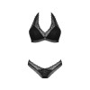 Conjunto de lingerie preto Medilla, da Obsessive, composto por sutiã com aros e tanga, numa elegante combinação de diferentes rendas macias. O sutiã inclui um delicado elemento decorativo entre as copas opacas com arame. O decote halter é ajustável, assim como o fecho de gancho nas costas. A tanga a condizer realça as pernas e o rabo de forma sedutora, com um corte sofisticado que combina conforto e sensualidade.