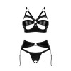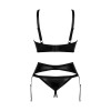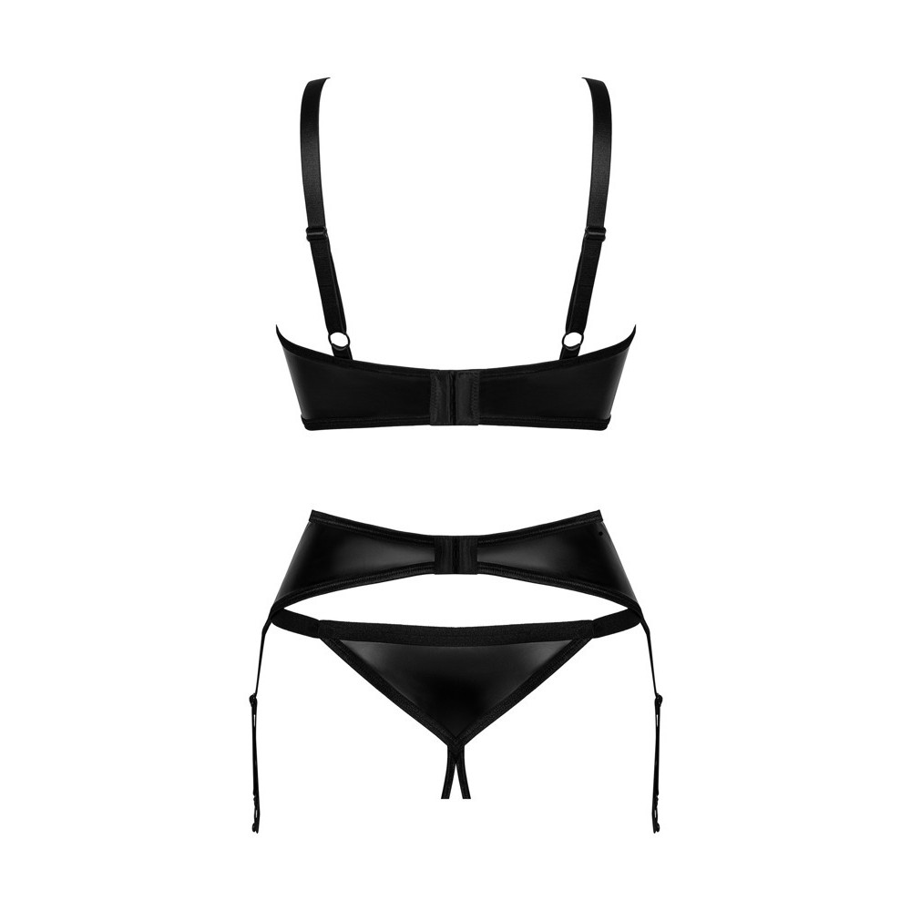 Conjunto Armares da Obsessive de 3 peças, composto por sutiã com armação, cinto de ligas e tanga sem entrepernas. Totalmente em estilo wet look, elástico e suave ao toque. O sutiã tem copas com recortes sedutores e um pequeno detalhe de joalharia. As alças, decoradas com argolas, podem ser ajustadas à medida, tal como o fecho de gancho nas costas. O cinto de ligas apresenta uma argola à frente e fecho de gancho ajustável atrás, com tiras de ligas também reguláveis. A tanga de aspeto molhado é sedutoramente aberta nas virilhas.
