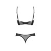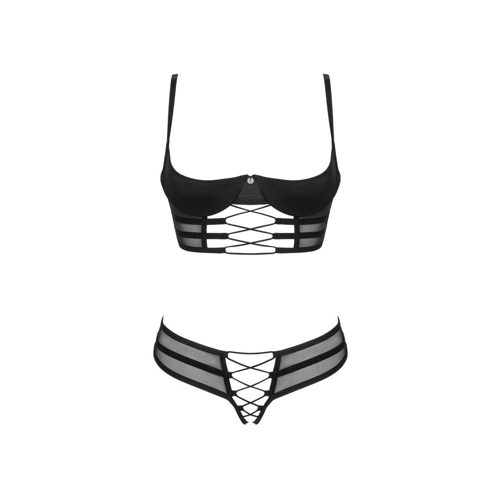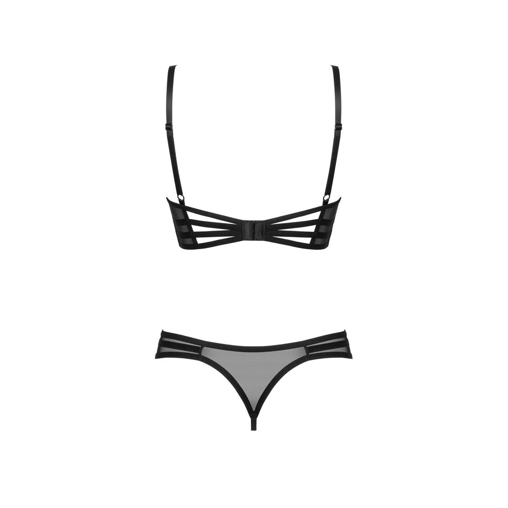 Sutiã com decote profundo e alongado e tanga aberta na virilha no conjunto Roxelia da Obsessive. Um estilo elegante concebido em tule transparente combinado com material elástico opaco. Suave e flexível para um elevado nível de conforto. A parte frontal de corte mais comprido, com copas almofadadas e aro, realça e valoriza o peito. Destacam-se ainda o detalhe em forma de laço com fita e o pequeno elemento de joalharia entre as copas. Alças elegantes e ajustáveis, com fecho de gancho regulável nas costas. A tanga seduz com fitas de renda na frente e virilha exposta.
