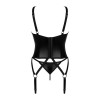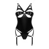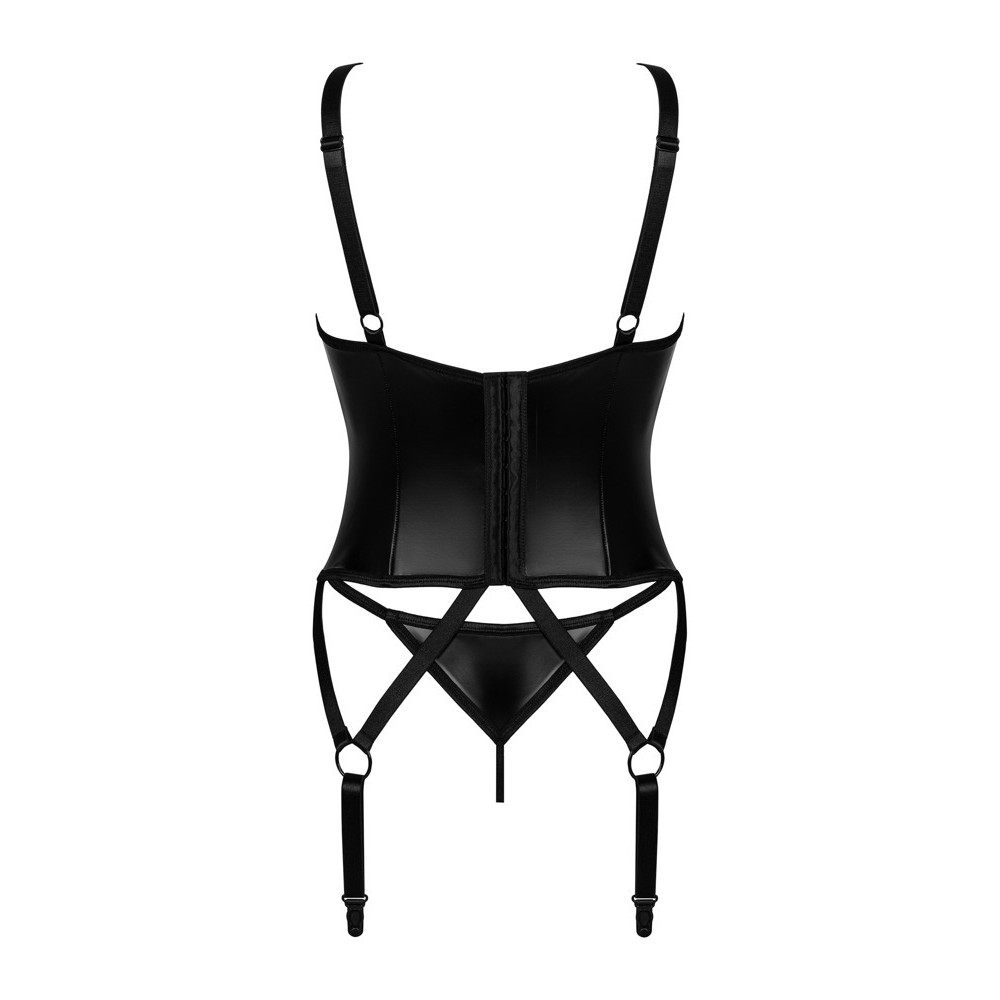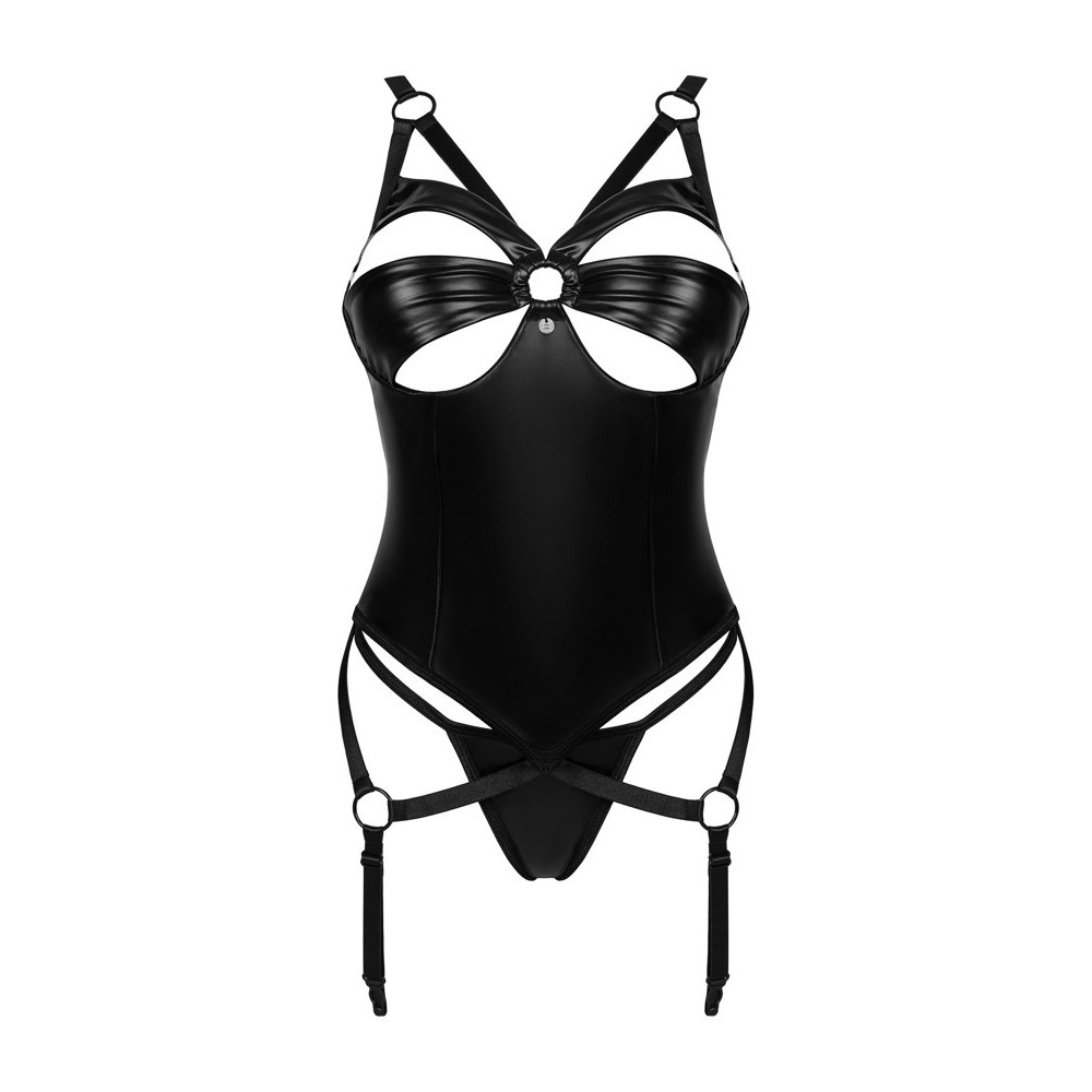 O conjunto Armares da Obsessive inclui corpete com ligas e tanga de ajuste perfeito, num estilo molhado moderno, elástico e macio. As copas com aros apresentam recortes sedutores e pequenos elementos de joalharia. As alças e tiras de ligas com argolas inteligentes são totalmente ajustáveis, assim como o fecho de gancho nas costas.