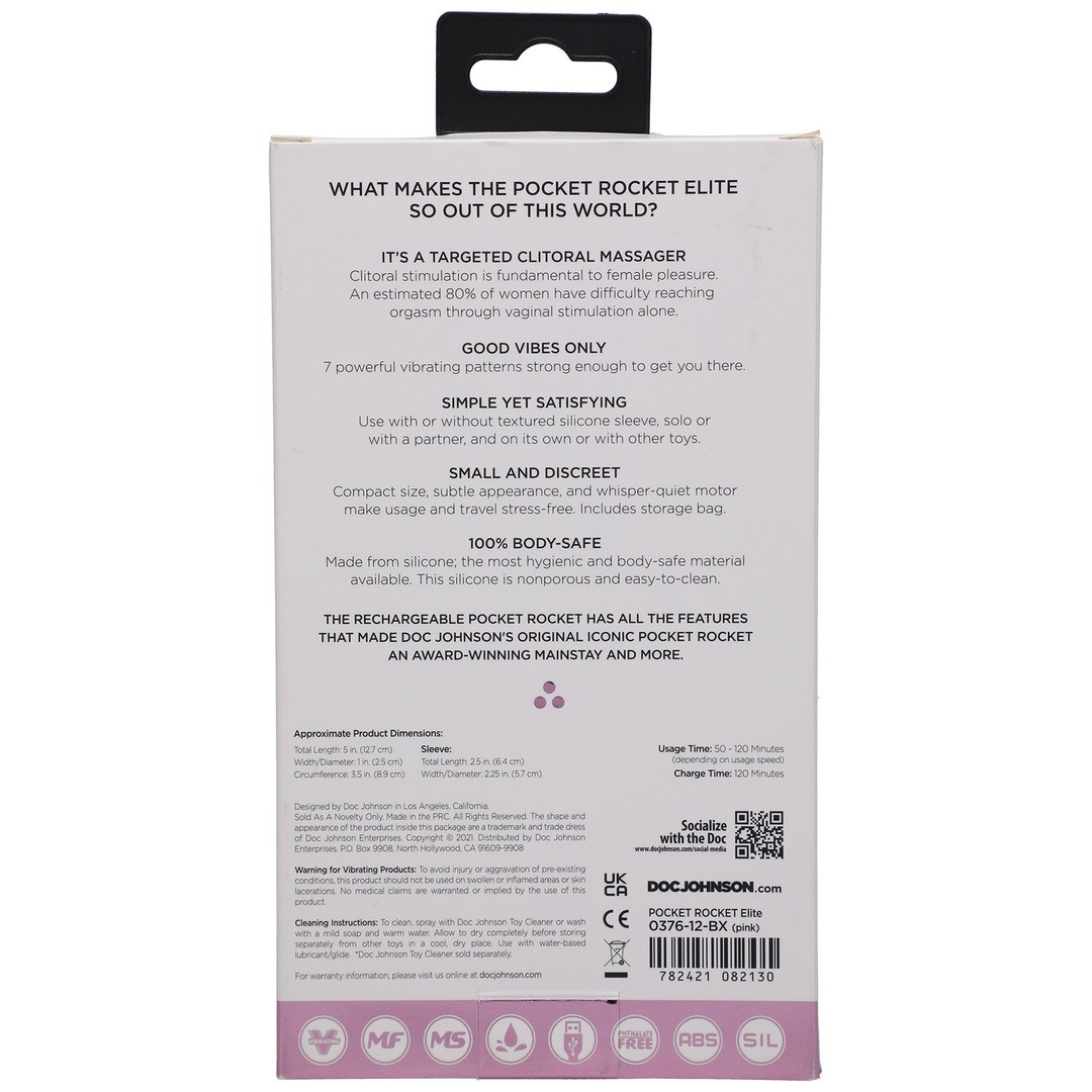 O Pocket Rocket Elite recarregável reúne todas as características que fizeram do Pocket Rocket original da Doc Johnson um produto premiado, e ainda mais. Este mini-vibrador discreto é fabricado em silicone de qualidade sanitária e apresenta uma elegante cor-de-rosa. É recarregável e acompanha uma manga de silicone texturada para sensações extra.
