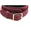 Conjunto de bondage em camurça borgonha e dourado, com algemas, coleira, trela e correntes ajustáveis.
