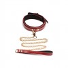 Conjunto Bondage em couro PU borgonha e dourado, com algemas, coleira, trela e correntes ajustáveis.