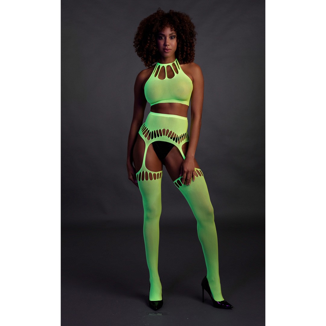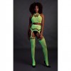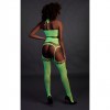 Conjunto Neon UV com top halterneck e meias de ligas — sensual, vibrante e feito para brilhar quando as luzes se apagam.