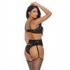 Conjunto de 3 peças com sutiã com aros, tanga de cintura subida e cinto de ligas em renda floral.
