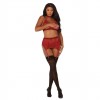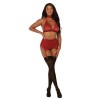 Conjunto de quatro peças que combina sensualidade e elegância em rede e renda, realçado por sofisticados detalhes em veludo elástico.