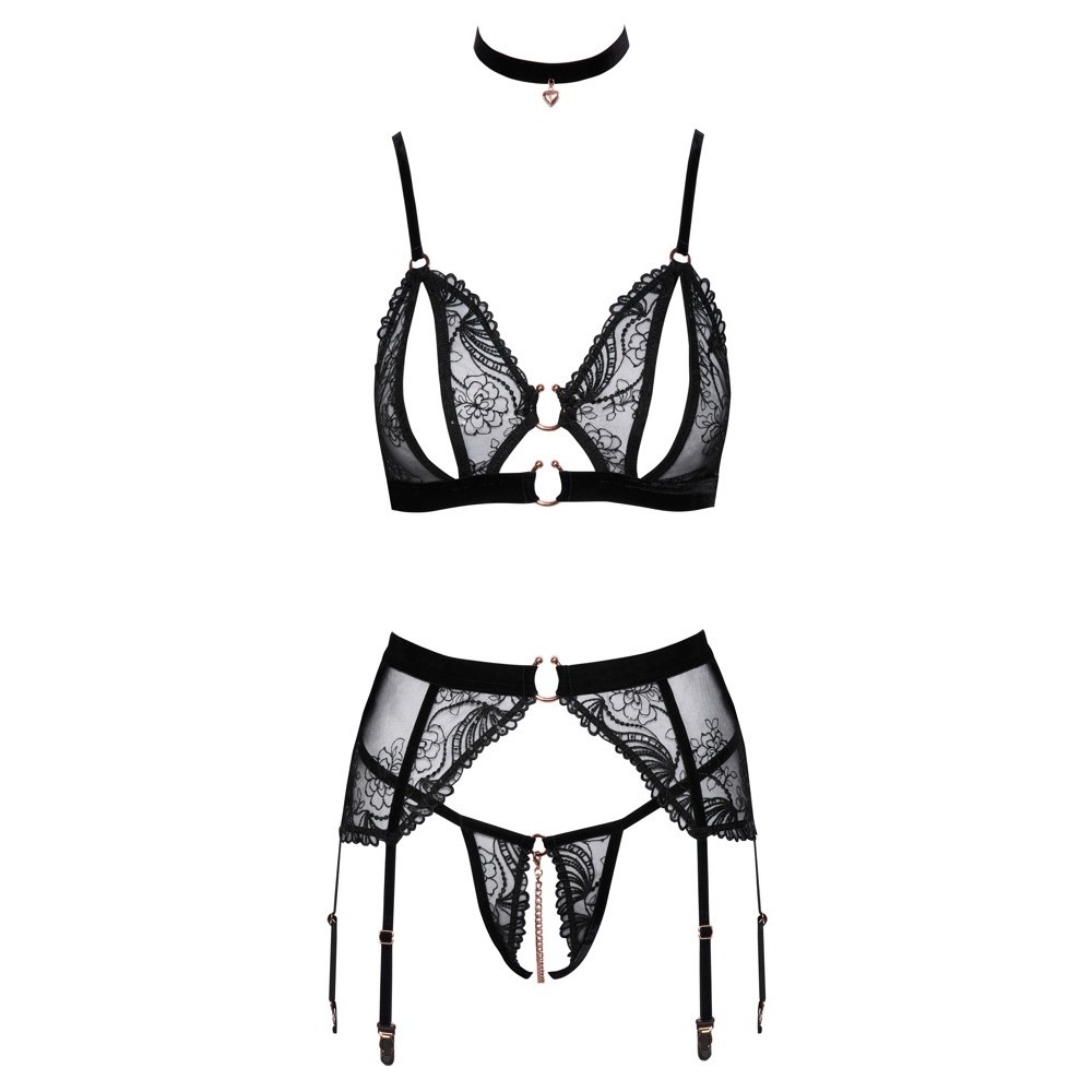 Conjunto elegante e erótico da Abierta Fina composto por sutiã sem aro, cinto de ligas, tanga sem entrepernas e gargantilha em veludo. Confeccionado em delicado tule preto com bordados elaborados e pequenas lantejoulas decorativas, é complementado por acessórios em tom ouro rosa e alças elásticas em veludo, que reforçam o seu carácter sofisticado.