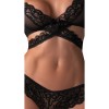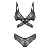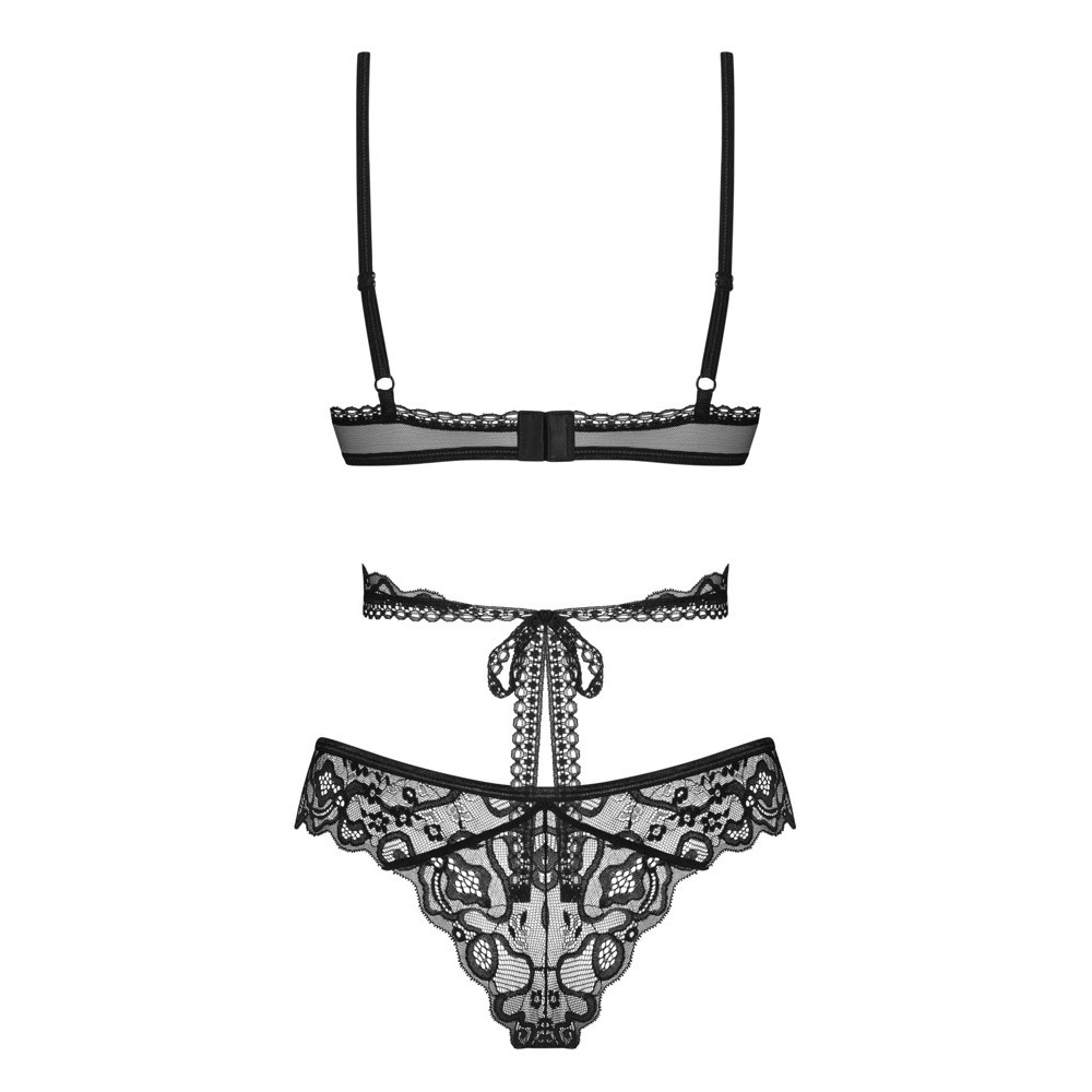 O conjunto de 2 peças com costas transparentes Blomentis da Obsessive contém um soutien e umas cuecas. É feito de uma delicada mistura de materiais. Os materiais são belas rendas e delicado tule elástico. O conjunto é macio e elástico para um ajuste muito confortável. O sutiã tem um pequeno laço entre as copas sem fios e há também tiras de renda que se cruzam por baixo dos seios - as alças podem ser ajustadas para se adaptarem. Há um pequeno pormenor decorativo na parte da frente das cuecas de renda.