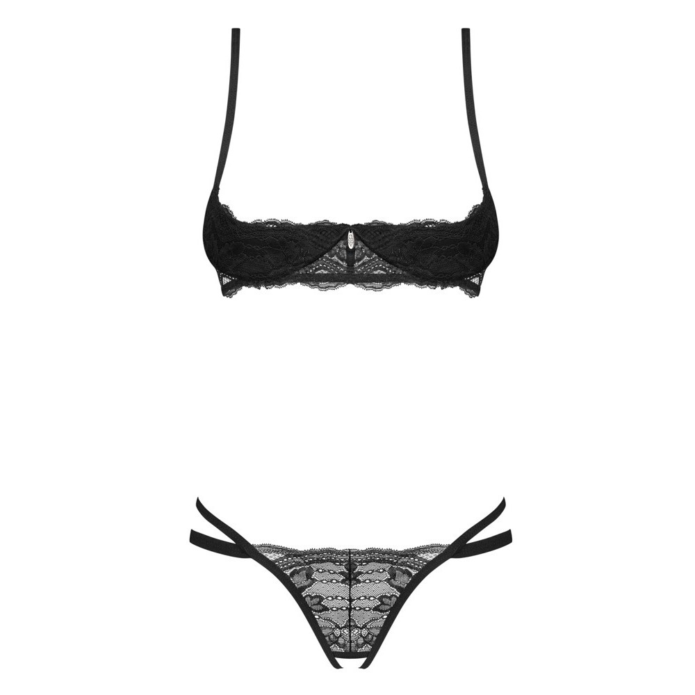 O conjunto preto sem virilhas, Nutris da Obsessive, contém um sutiã de prateleira com aros e um string sem virilhas. O conjunto é feito de uma bonita e suave renda elástica. O sutiã com armação suporta os seios de uma forma perfeita. O elemento delicado entre as copas é um verdadeiro chamariz. O fecho de gancho nas costas e as alças são ajustáveis. O bonito string de renda sedutoramente sem virilhas.