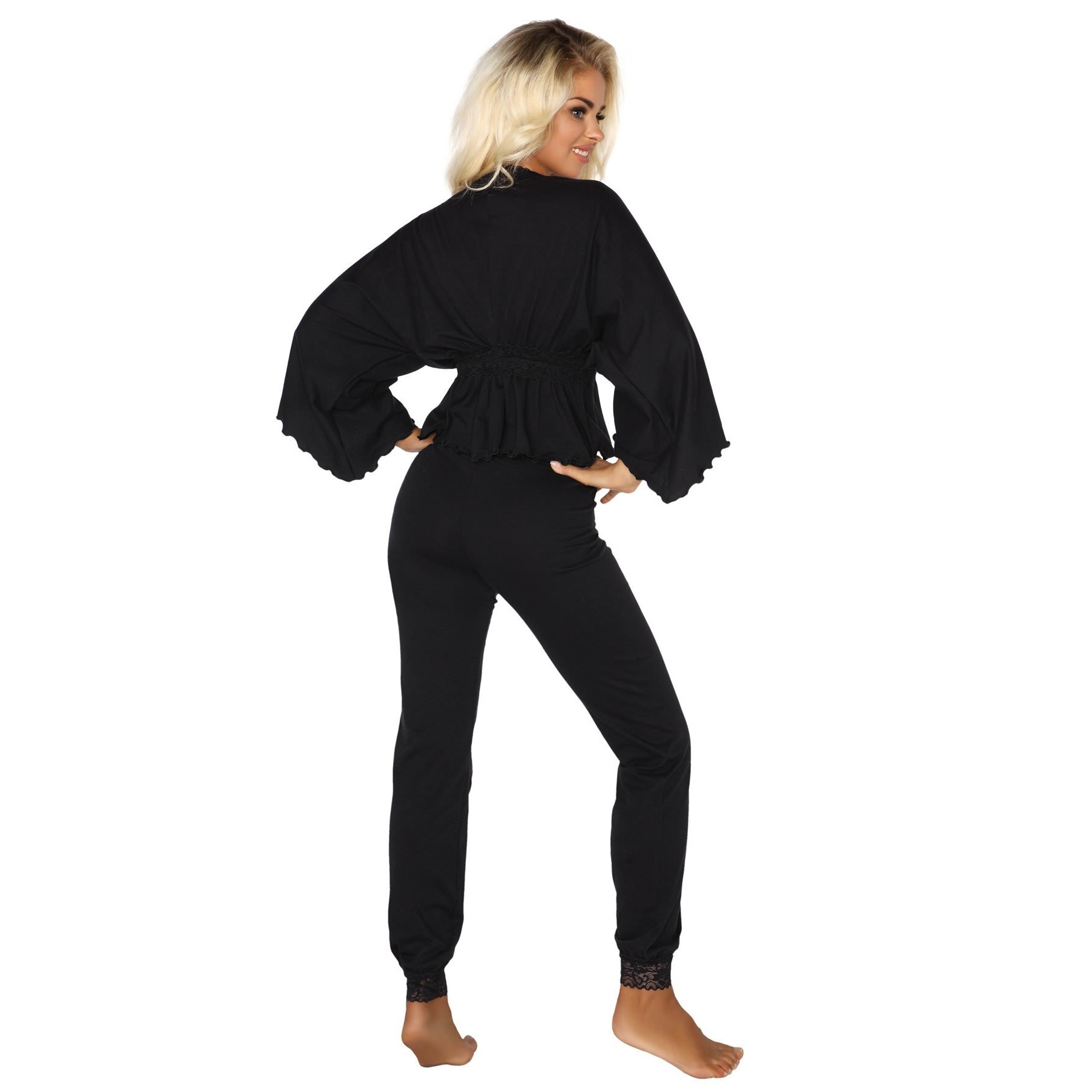 Conjunto sexy de duas peças em algodão de toque agradável e renda elegante. Pode ser tanto um pijama como uma roupa de casa. Top curto com mangas largas e cintura revelada. Calças compridas e confortáveis com acabamento em renda.