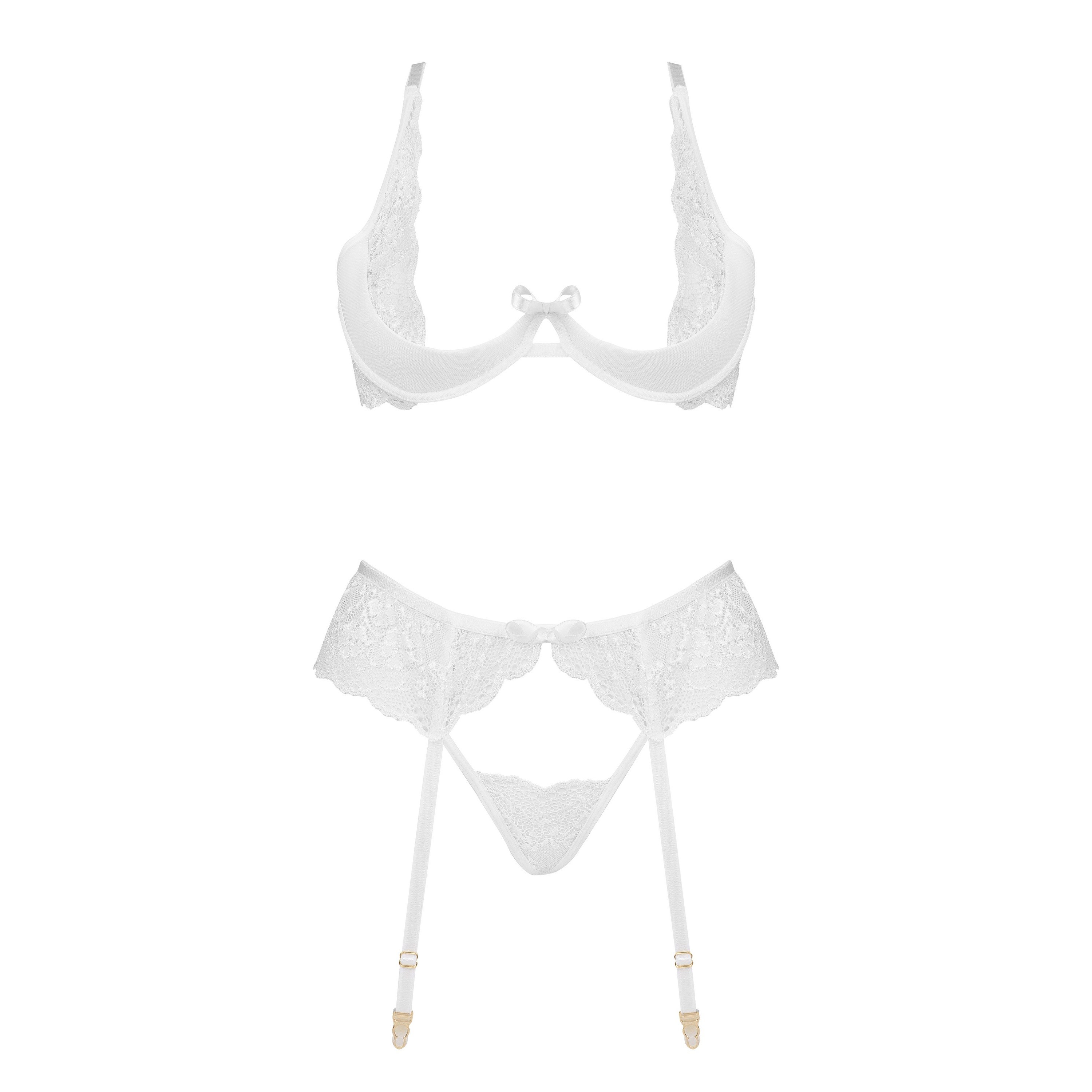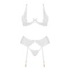 Apresentamos o sensual conjunto de lingerie branca Rose set, que inclui um sutiã, uma tanga e um cinto de ligas.