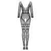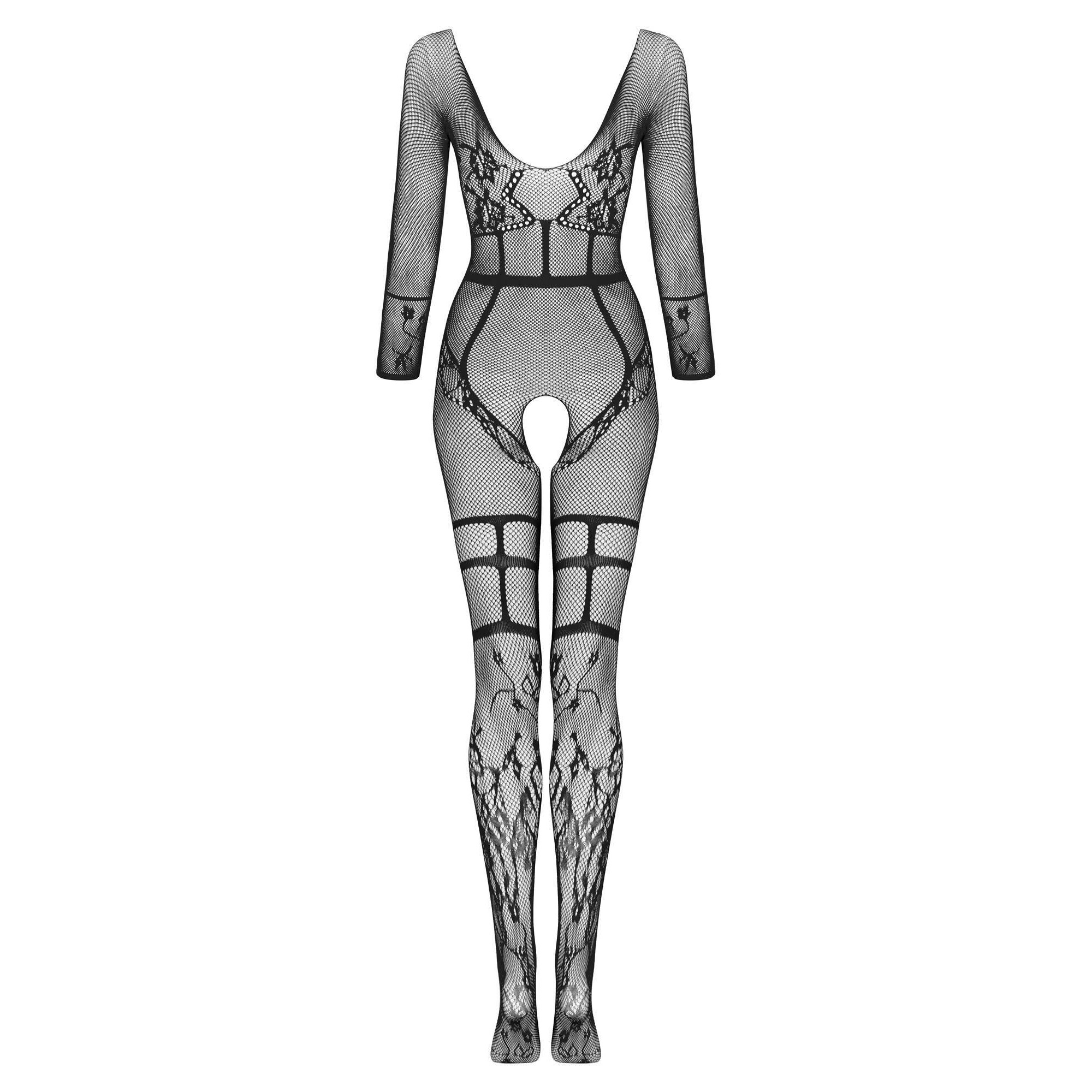 Um catsuit super sexy para os amantes de roupa interior confortável, feito de fio preto e delicado. O motivo em rede é complementado por impressionantes aplicações florais e tiras na cintura e nas coxas.