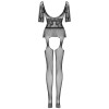 Bodystocking super sexy para os amantes de roupa interior confortável, feito de fio preto e delicado. A parte superior é uma T-shirt sexy de manga curta decorada com aplicações florais e um cinto que realça a cintura.
