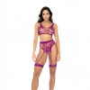 Бюстгальтер украшен нежным цветочным узором с провокационным перекрещивающимся элементом в области груди, придающим образу нужную нотку загадочности. Соответствующие стринги с высокой талией созданы для подчеркивания фигуры, с встроенными ремешками, которые продолжаются и соединяются с широкими, закругленными и смелыми лентами, создавая очаровательный силуэт со всех сторон.